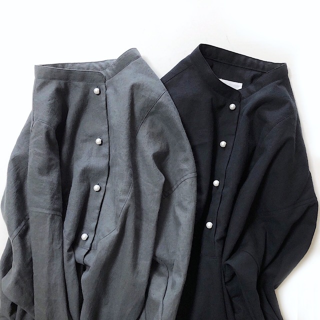 - 日々のシャツ - 仕事着、部屋着、お出掛け着 オーバーサイズで柔らかな素材がリラックス出来て動きやすく それでいて上品なデザイン 日々の生活に溶け込むようなお洋服です ・デザイン ビブヨーク切替のチュニックシャツ 全体に丸いポイントを散りばめて作っています (前のヨーク・衿先・カフス・裾のライン・袖の切替) 袖口の開きを前側にしてカフスの丸みが見えるようにしました 袖口開きから続く前袖切替も丸みを持たせています 衿はバンドカラー 両脇にシームポケット付き ・シルエット オーバーサイズで肩〜裾までストンと落ち 裾がやや広がるシルエット 袖丈はカフスが太い分やや長めで 指が出るくらいにしています 長さが気になる際は カフス釦を1つ外して折り返したり腕をまくったり そのシルエットもまた楽しんで頂けます ・コーディネート ワイドパンツ、クロップトパンツ、スキニーパンツ 【素材】 ・生地の厚み 薄め ----- 中肉 ----- 厚め ○ ・コットンリネン(日本製) くたくたに揉み込まれたコットンとリネンの混紡が 柔らかく小慣れた雰囲気を演出 程よい厚みで、やや透け感があります 【品質表示】 リネン 55% コットン 45% お洗濯 :ご家庭でのお洗濯が可能です 手洗いをお勧めいたします 中性洗剤+水洗い クリーニングネット使用 タンブラー乾燥はお避けください アイロン:低温〜中温 裏から浮かせぎみにアイロンかけ ※5の釦を選択のお客様 ご注意 :ガラス釦(第2釦のもの)は繊細な釦で、 力を加えると割れる可能性があります お洗濯はなるべく手洗い、 または釦を止めて裏返し+ネットに入れ 更にアルミホイルを巻いて頂くと安心です 【オプション】 オプションより選択後、②③はご希望を備考欄にご記載ください。 記載以外の寸法ご希望の場合、事前にご連絡ください。 ①釦選択 1.高瀬貝 2.- 3.パール釦(マッドなツヤ消し)→ +500円 4.- 5.ヴィンテージガラス釦&いろんな貝釦 → +2500円 ②着丈変更 ・着丈詰め 無料で承っております。 ・着丈延長 → 5㎝以内 +1000円 6~10㎝ +1500円 ③袖丈の変更 ・袖丈詰め(5㎝以内)→ 追加料金+500円 ・延長(5㎝以内)→ 追加料金+500円 【商品サイズ】 着丈 肩幅 バスト 袖丈 裄丈 袖口 腕周り FREE 85 56 122(114) 51 79 23.5 48.5 ※着丈 → 後中心衿付け位置~裾まで ※バスト()内 → 後タックを除いた寸法 ※裄丈 → 肩幅の1/2+袖丈 【着用モデル体型サイズ】 普段S〜Mサイズ 身長 156㎝ 肩幅 36㎝ 袖丈 50㎝ ●カラー展開 オフホワイト チャコールグレー ブラック ●同素材シリーズ ラウンドワンピース